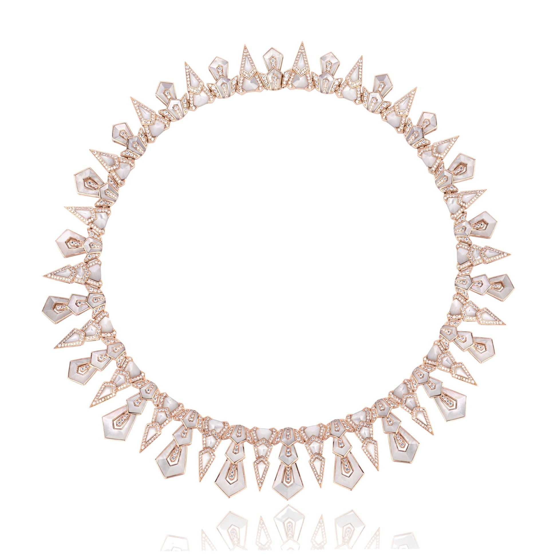 Art Deco Mother of Pearl Choker, designed in 18KP gold, with a weight of 77.67 G. Crafted with meticulous attention, it reflects character, structure, and individuality—ideal for collectors and connoisseurs of refined forms.